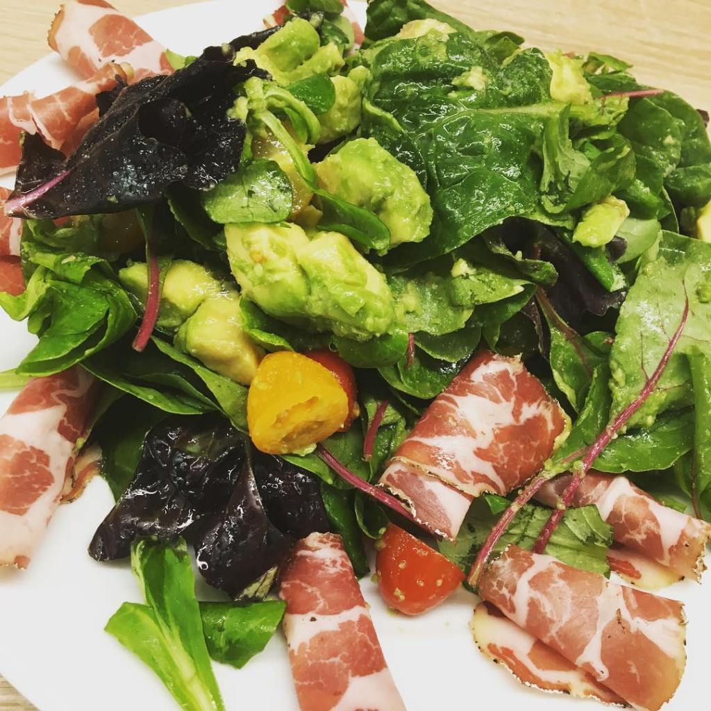 Hier ein paar Fotos von meinem Mittagessen mit -zum Beispiel- Lachs und Salat und etwas MCT Öl und Himalaya Salz als Dressing, oder mit Avocado und Schinken oder auch mit Eiern und Speck (das Obst ggf. lieber nur anteilig genießen):