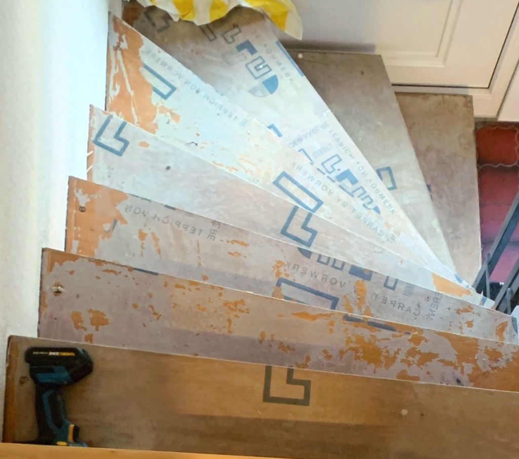 Ich werde nun Schritt für Schritt erklären, wie wir zunächst den Kleber des Todes von den Stufen entfernt, die Treppenstufen daraufhin sorgsam geschliffen haben und dann endlich wieder in ihrem Originalzustand bringen und final einbauen konnten.