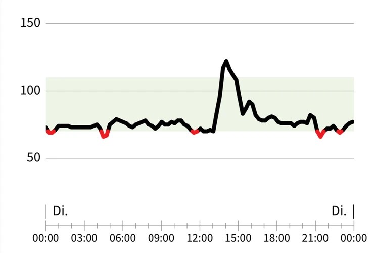 It feels like we found a pattern: After having found a balanced level after some adjustment time after the meal, the glucose level stays at a low-normal level until the next meal.